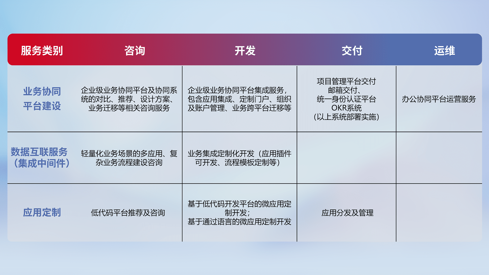 针对钉钉、、企微、、、IDaas等平台级产品提供产品的规划、、、、方案、、、交付、、、定制化开发等服务,,,,实现如统一协同办公、、、智能客户服务、、混合会议管理、、智能数据查询、、等业务场景,,实现数字化转型。。。。