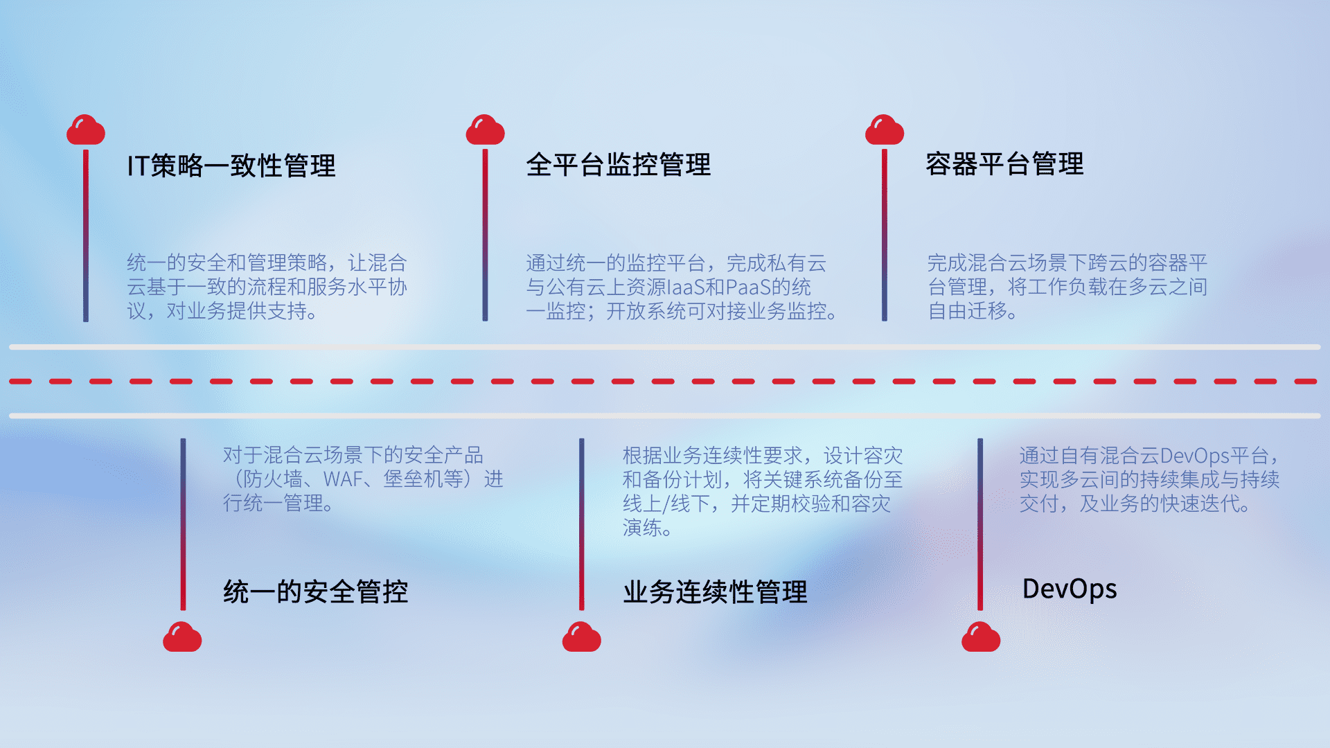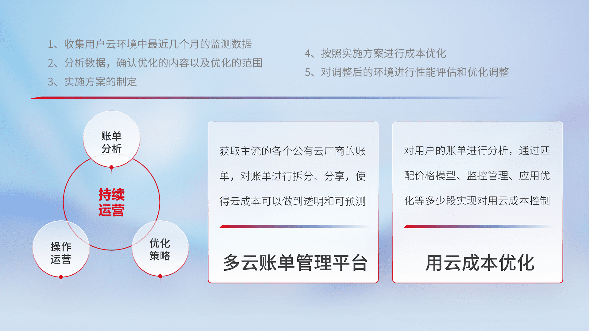 通过多云纳管,,,以统一的资源数据模型把客户的云资源进行抽象和封装,,,,进而实现对多云资源的统一操作,,保障云资源管理的可靠性、、稳定性与可用性。。量身定制化运维内容,,,配置、、、、开发运维、、、补丁管理、、备份、、、、监控、、认证和访问管理、、、、审计和日常巡检等,,,保障在用云过程中的可靠度,,稳定度以及高可用率。。。