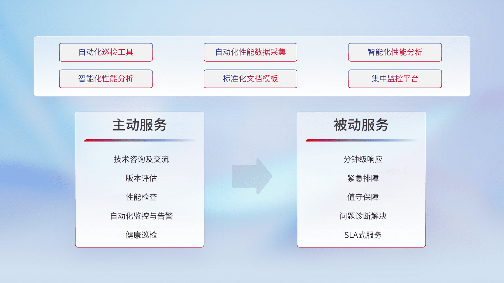 智能化工具和标准化文档,,保障服务质量,,,,提供主动服务(包含技术咨询、、版本评估、、、、性能检查、、、自动化监控与告警、、健康巡检)和被动服务包含(分钟级响应、、、紧急排障、、、、值守保障、、问题诊断解决、、SLA服务)。。。。